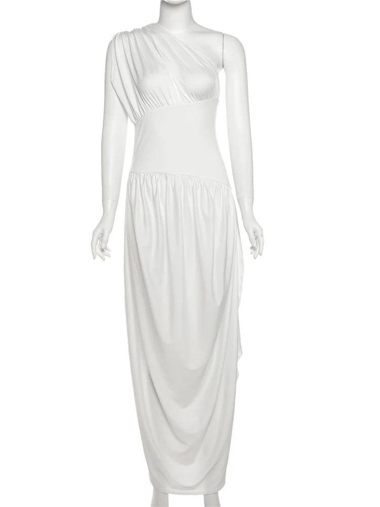Elevate your summer wardrobe with this Asymmetrical Maxi Dress featuring slanted shoulders. Crafted from high-stretch polyester and spandex, its slim fit enhances your silhouette while ensuring comfort.