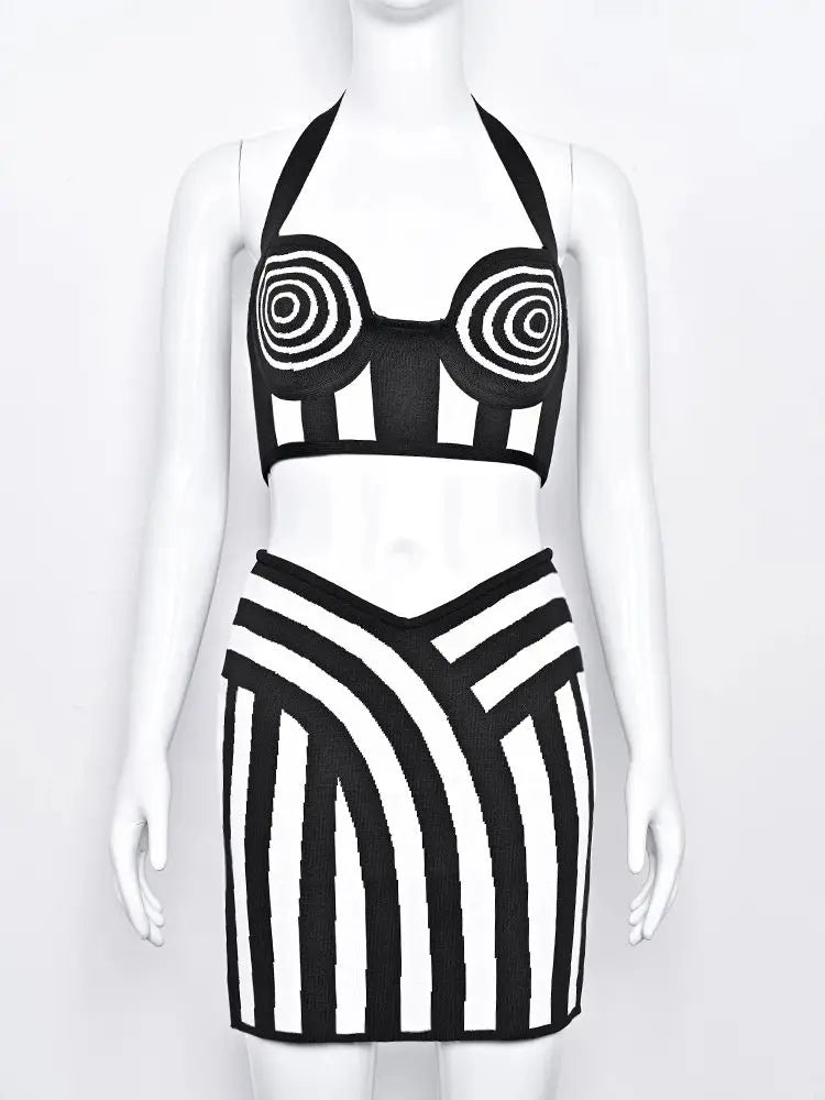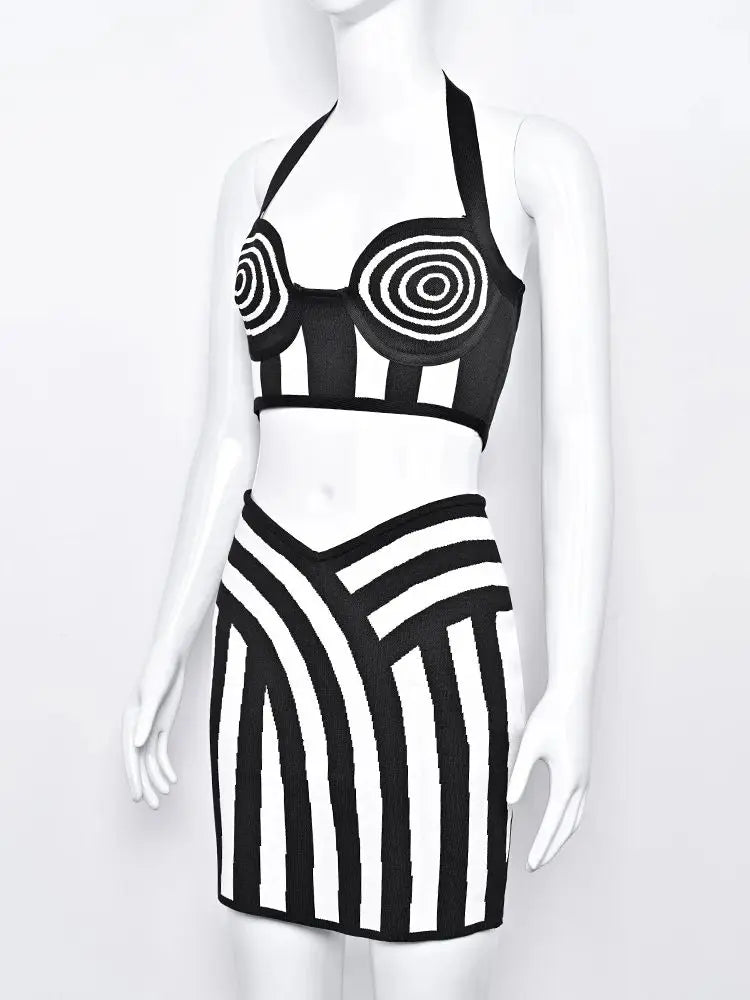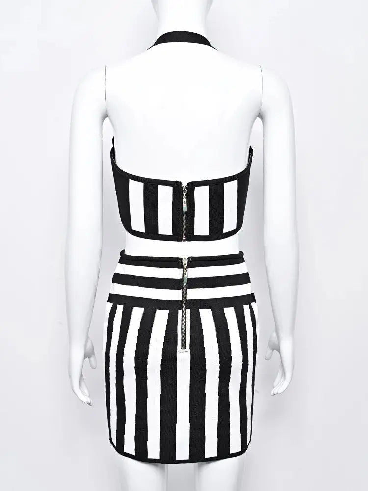 Elevate your wardrobe with the Contrast Black and White Bandage Striped Halter Bustier Set from VestiVogue. This stunning gown is designed for all seasons, featuring a sexy and club-ready style that is sure to turn heads.