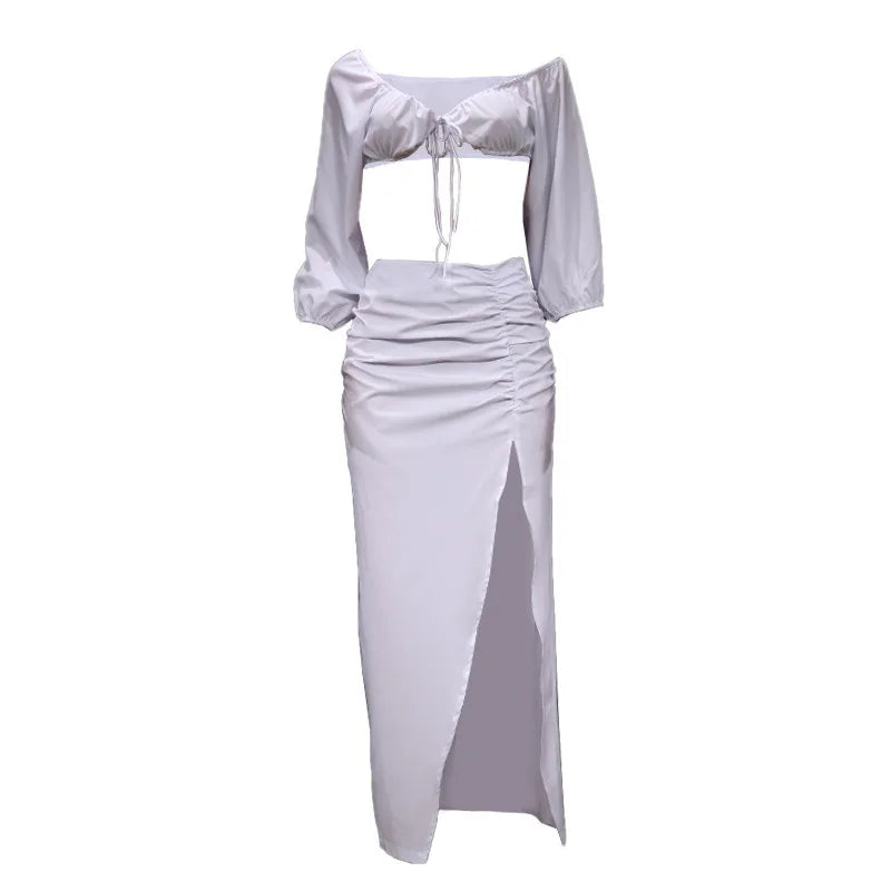 Cropped Half-Sleeve Bra Top & High Slit Pleated Skirt Set